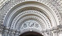 Like most Romanesque buildings, University College has extremely thick masonry walls, built of many types of brick and stone layered upon each other.[3] The main materials include wood, stone, brick, slate, iron, mortar, and tile. Only about one third of the exterior is stone, with the rest being a very pale yellow brick produced at a brickyard on Yonge Street.[17] University College has the characteristic arched and rounded windows as well as huge, cavernous facades.[3] A major feature of University College is arches laid out in series and sets. The arches are semicircular, and consist of small columns that provide the structural support to hold up vaults on the side of walkways. There is much ornamentation, especially in the form of stone carvings, liberally applied on the walls, arches, columns and façades of the building. Carved images include nature, animals, mysterious creatures as well as the college shield and motto. The building also features several stained glass windows, including the rose window by Robert McCausland.
