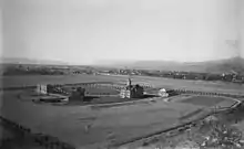 The first set of buildings were set up around the oval in 1895. Since that time, various campus plans and architectural styles have been used. Today the campus consists of 220 acres (89 ha) and is bordered to the east by Mount Sentinel and the north by the Clark Fork River. The main campus comprises 64 buildings, including nine residence halls and various athletic venues, including Washington–Grizzly Stadium, a 26,500-seat football stadium and the Adams Center (formerly, Dahlberg Arena), a 7,500-seat multi-purpose arena where the university's basketball teams play.
