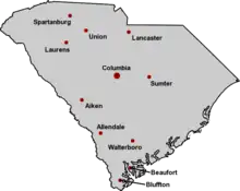Four of the campuses have branches in nearby locales. USC Beaufort has a branch in Bluffton, USC Union has a branch in Laurens, USC Salkehatchie has its main campus in Allendale with a branch in Walterboro, and USC Upstate has a branch in Greenville.