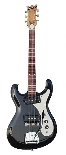 The Hi-Flier model debuted in 1967, with two P-90-style pickups. The design is loosely based on the body shape of the Mosrite Mark 1 and its later iterations, though with a thinner and much lighter body. The top of the Hi-Flier headstock has two U-shaped cuts, echoing the three-notch "M" shape of the Mosrite. The pickguard shape and control layout also mimicked Mosrite.