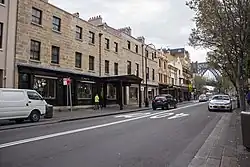 Unwin's Stores comprise a row of sandstone commercial buildings, originally with residences over, fronting George Street. These five sandstone buildings, originally built as shops and dwellings, were erected by Frederic Wright Unwin between 1843 and 1846. They were constructed during a depression in the Colony's economy, in the decade prior to the discovery of gold. Thus, their architectural style reflects not only the prevailing style, Colonial Georgian, but also the relative austerity of the area during this period.[15]