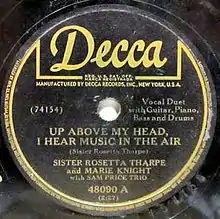 "Up Above My Head" is a gospel song of traditional origin, first recorded in 1941 (as "Above My Head I Hear Music In The Air") by The Southern Sons, a vocal group formed by William Langford of the Golden Gate Quartet.[1] In the version that is now the best-known, it was recorded in 1947 by Sister Rosetta Tharpe and Marie Knight as a duo.