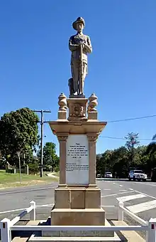 The Upper Coomera Shire War Memorial is on the corner of Oxenford and Tamborine Road (27°54′05″S 153°17′18″E / 27.90152°S 153.28828°E) and was unveiled on Saturday 18 May 1918 by Edward Macartney, Member of the Queesland Legislative Assembly.[15] The memorial originally only honoured those from the district who fell in World War I; however, the names of those who perished during World War II were added later.[16] The inscriptions on the memorial read:[17]