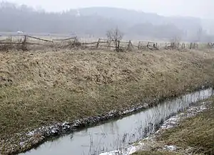 The Valicka brook/small river at Bocfolde with Csatar church's steeple in the background