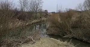 The Válicka brook/small river, at right, merges with Zala river at Csácsbozsok locale of Zalaegerszeg city, Zala county, Hungary.