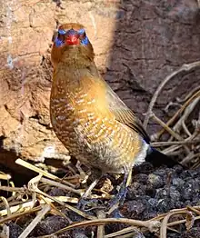 The length averages 13.3 cm (5.25 in). All ages and sexes have a black tail, and adults have a red bill. The male has a cinnamon-colored head and neck with a blue patch surrounding the eye. The rump is purplish blue and the underparts are violet-blue with variable rufous patches. The female is smaller and mostly cinnamon brown with white barring on the underparts and silver-blue eyepatches. Juveniles are like females, but mostly unbarred tawny-brown with a reddish-brown bill.[2]
