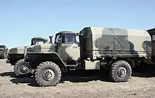 The Ural-4320 is a general purpose off-road 6×6 vehicle, produced at the Ural Automotive Plant in Miass, Russia for use in the Russian army. Introduced in 1976, it continued in production as of 2023. The wheel arrangement for the Ural-4320 was designed for transporting cargo, people and trailers on all types of roads and terrain. It also serves as a launching platform for the BM-21 "Grad" rocket launcher.