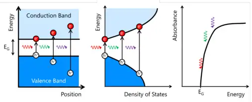 While not apparent in a simple energy-position band diagram (left), the density of states (centre) in both the valance band and the conduction band increases the further from the band gap. This means the absorbance of the semiconductor will increase with energy.