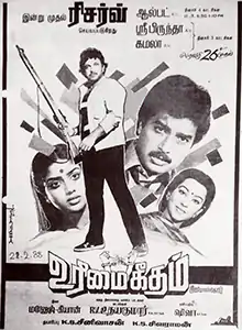 Urimai Geetham (transl. Song of liberation)[2] is a 1988 Indian Tamil-language thriller film written and directed by R. V. Udayakumar, in his directorial debut.[3] The film stars Prabhu and Karthik. It was released on 26 February 1988.[4][5] Udayakumar won the Best New face (Director) award at the 9th Cinema Express Awards.[6]
