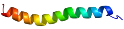 Urocortin is a peptide composed of 40 amino acids. Urocortin is composed of a single alpha helix structure. The human UCN gene contains two exons, and the entirety of the coding region is contained within the second exon.[5] Urocortin is expressed widely in the central and peripheral nervous systems, with a pattern similar to that of CRF.[8] Areas of similarity between urocortin and CRF expression include the supraoptic nucleus and the hippocampus.[9][10] Urocortin is also expressed in areas distinct from CRF expression; these areas notably include the median eminence, the Edinger-Westphal nucleus, and the sphenoid nucleus.[10] Additionally, Urocortin is expressed in peripheral tissues such as the heart.[11]