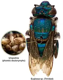 Various Uropodina are associated with bees and/or bee nests: Trachytidae (Uroseius), Trematuridae (Trematura, Trichouropoda, Trichosociata, and Pseuduropoda), Uroactiniidae (Uroactinia), Urodinychidae (Uroobovella, Uroobovella (Fuscouropoda)), and Uropodidae (Uropoda). Their bee hosts include honey bees (Apis), bumble bees (Bombus), Euglossa orchid bees, and Melipona stingless bees. They are believed to be harmless to bees.[3]