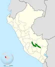 The Urubamba antpitta is endemic to the Peruvian departments of Junín and Cusco. Subspecies G. o. occabambae is found west of the Yanatili river valley, and subspecies G. o. marcapatensis is found to the Yanatili's east.[1] It inhabits humid montane forest and prefers the understory or forest floor.[2] It is found at elevations of 2,450–3,650 m.[3]