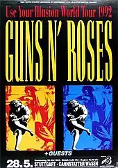 The Use Your Illusion Tour was a concert tour by American rock band Guns N' Roses which ran from January 20, 1991, to July 17, 1993. It was not only the band's longest tour, but one of the longest concert tours in rock history, consisting of 194 shows in 27 countries.[1] It was also a source of much infamy for the band, due to riots, late starts, cancellations and outspoken rantings by Axl Rose.