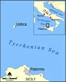 Ustica (Italian pronunciation: [ˈustika];[3] Sicilian: Ùstica) is a small Italian island in the Tyrrhenian Sea. It is about 5 kilometres (3 mi) across and is situated 52 kilometres (32 mi) north of Capo Gallo, Sicily. Roughly 1,300 people live in the comune (municipality) of the same name. There is a regular ferry service from the island to Palermo in Sicily.