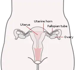 The uterine horns (cornua of uterus) are the points in the upper uterus where the fallopian tubes or oviducts exit to meet the ovaries. They are one of the points of attachment for the round ligament of uterus (the other being the mons pubis). They also provide attachment to the ovarian ligament, which is located below the fallopian tube at the back, while the round ligament of uterus is located below the tube at the front.