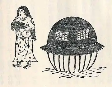 A well known Japanese legend is that of the origin of the Kōno clan of the Iyo Province.[8] In the 7th century, a fisherman named 'Wakegorō' (和気五郎) from Gogo island found a 13-year-old girl inside an Utsuro-bune drifting at sea. He brought her to land, where she told him that she was the daughter of the Chinese emperor and that she had been forced to flee to escape her stepmother. The fisherman named her "Wake-hime" (和気姫) ("princess Wake") and raised her, before she married an imperial prince of Iyo province and gave birth to a son named "Ochimiko" (小千御子), the ancestor of the Kōno clan. A part of this folktale held that she was responsible for bringing the first silk cocoons to Japan. Princess Wake is still worshiped at the Funakoshi Wakehime Shinto shrine[9] in the village of Funakoshi on Gogo island.[1][10][11]