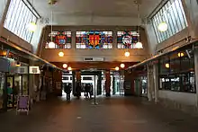 The stained glass panels by Erwin Bossanyi at the booking hall end of the platforms reflect the area's heraldic associations.[12] The crown and three seaxes on a red background are the arms of Middlesex County Council and the chained swan on a black and red background is associated with Buckinghamshire. The centre shield is possibly the arms of the local Basset family; a downward-pointing red triangle on a gold background was borrowed from the Bassett arms for use on the arms of Uxbridge Urban District Council in 1948.