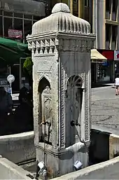 The Telli Fountain (Turkish: Telli Çeşme) is a four-sided four-taps stone drinking fountain located in the Telli Square in the center of the city. Taking the ornaments and the design of the fountain in consideration, it is believed that it was built in the Tulip period in beginning of the 18th century. The motifs carved on the stone fountain are curved branches and cypress. There are also relief motifs of Istanbul tulip, which is extinct today. The inscription and the decorations on the fountain were erased during the Greek occupation of Uzunköprü. Only their traces are visible today. The fountain was moved to its current place in 1960.