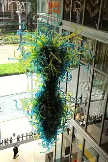 The V&A Rotunda Chandelier (often known as V&A Chandelier and originally called Ice Blue and Spring Green Chandelier) is a glass sculpture by Dale Chihuly. It hangs under the glass rotunda at the entrance to the Victoria and Albert Museum in South Kensington, London. Considered to be an artwork as much as a source of light, it was installed in 1999 and then substantially altered and enlarged to its current size in 2001, coinciding with a V&A exhibition of the artist's work.