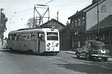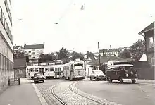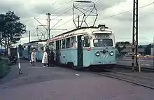 KSS merged in May 1924 to create Oslo Sporveier and it took over services on the Vålerenga Line. The Østensjø Line was extended to Oppsal in 1926. However, Oslo Sporveier and Akersbanerne could not come to terms regarding the lease of the Vålerenga Line. The issue was driven by the lack of a suitable turning loop with free capacity in the city center. Instead, Akersbanerne decided to operate the trams to Etterstad, where there would be transfer, without transfer tickets, between the two tram companies.[3] From 1927 the line was served by trams 6 and 16.[10] The situation was resolved from 4 January 1937, when Bærumsbanen took over operations on the Østensjø Line. It already operated the Lilleaker Line in a similar fashion on the other end of town, which also suffered under the lack of turning capacity through town. The predominantly used Gullfisk trams on their service.[3]