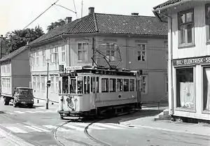 The Vålerenga Line was a branch of the Gamlebyen Line, which served the neighborhoods of Vålerenga, Helsfyr and Etterstad. The Vålerenga Line branched from the Gamlebyen Line in Schewigaards gate and continued along it before following St. Halvars gate, Enebakkveien, Vålerenggata and finally Etterstadgata.[1] From 1923 part of the tracks were rearranged, so that the upward tracks (bound northeast) went through Vålerengagata, while the downward bound tracks placed in Strømsveien. The line was also extended over the Gjøvik Line.[2] The line originally had its terminus in Etterstadgata,[1] but from 1926 it was placed at Grensen, on the municipal border.[2] From there the line continued as the Østensjø Line as a suburban light rail.[3]