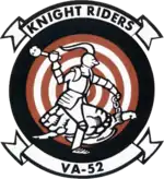 VA-52 was an Attack Squadron of the U.S. Navy. It was established as U.S. Navy Reserve Fighter Squadron VF-884 on 1 November 1949, and called to active duty on 20 July 1950. It was redesignated VF-144 on 4 February 1953, and VA-52 on 23 February 1959. The squadron was nicknamed the Bitter Birds from about 1951–1953, and the Knightriders from about 1960 onward. Its insignia evolved through several versions and variations from 1951 to the 1980s.[1] VA-52 was decommissioned on 31 March 1995.[2]