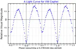 VW Cephei (VW Cep) is an eclipsing contact binary of W Ursae Majoris-type located roughly at 90.6 light years from the Sun, whose two component stars share a common outer layer. Because the two components share their outer layers, as the components of W Ursae Majoris do, they have the same stellar classification, and are classified as yellow G-type main sequence dwarfs. The components take 0.2783 days (roughly 6.7 hours) to revolve around a common barycentre. Orbital period variations suggest the presence of one more additional perturbing objects of likely low-mass stellar nature.
