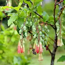 This shrub can reach up to 3 meters in height. It is also a hermaphrodite. The serrated leaves are elongated and have sharp tips. Initially red, the apical shoots may have a bright red colour. The flowers are trumpet-shaped, with a pinkish white colour, and usually occur in clusters. In autumn the leaves may change to a reddish-yellow. The black fruit is a pseudo-berry, and are said to be juicy and fleshy.[5][6]