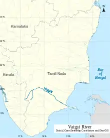 The Vaigai is a river in the Tamil Nadu state of southern India; it passes through the towns of Theni, Madurai and Ramanathapuram.[2] It originates in Varusanadu Hills, the Periyar Plateau of the Western Ghats range, and flows northeast through the Kambam Valley, which lies between the Palani Hills to the north and the Varushanad Hills to the south. The Vattaparai Falls are located on this river. As it rounds the eastern corner of the Varushanad Hills, the river turns southeast, running through the region of Pandya Nadu. Madurai, the largest city in the Pandya Nadu region and its ancient capital, lies on the Vaigai. The river empties into the Palk Bay near Alagankulam, close to Pamban Bridge in Ramanathapuram District.