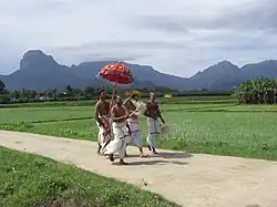 As per a Hindu legend, Nambaduvan, a peasant and singer (locally called panan) from lower section of the society, was an ardent devotee of Vishnu. On account of his low life, he never entered the temple and worshipped from outside. While walking towards the temple one day, he was stopped by a asura. He sang the verses which he set for the presiding deity to him. He also assured the asura that he will come back from the temple when the asura can consume him. Nambi, the presiding deity was pleased by his devotion and appeared outside the temple. While returning, Nambi appeared as a Brahmin and tried to convince him to escape the asura. But Nambudavan was staunch and wanted to be true to his promise. The asura was pleased by the songs and said it did not want to consume him anymore. It is believed that the asura was a Brahmin who was cursed during his previous birth as he was not sincere doing his penance. He was relieved off his curse listening to the songs of Nambaduvan.[2]