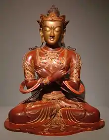 Vajradhara (Sanskrit: वज्रधर, lit. 'Diamond-holder'; Tibetan: རྡོ་རྗེ་འཆང, Wylie: rdo rje 'chang, THL: Dorje Chang; Chinese: 金剛總持; pinyin: Jīngāng zǒng chí; Javanese: Kabajradharan; Japanese: 持金剛仏; Vietnamese: Kim Cang Tổng Trì) is the ultimate primordial Buddha, or Adi-Buddha, according to the Sakya,[1] Gelug and Kagyu schools of Tibetan Buddhism.[2] It is also a name of Indra, because "Vajra" means diamond, as well as the thunderbolt, or anything hard more generally.