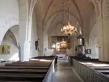 The exterior of the church is largely Gothic in appearance, but contains remains of the first, Romanesque church as well as a few later alterations. It is built of granite and brick.[1] As for the interior of the church, it is a single-aisled church with two side-chapels and without an apse. The side chapels are unusual in that they were vaulted already during the 14th century; most of the churches in the vicinity did not receive proper brick vaults until the 15th century.[3] The interior of the church is decorated with frescos dating from several periods, some possibly made by Albertus Pictor.[1] They were covered in whitewash during the 18th century and laid bare again during the 20th century but remain somewhat damaged.[3] Among the furnishings, the unusually large, 16th-century carved and gilded altarpiece made in Antwerp merits special mention. It is one of the largest of its kind in Sweden.[2] There is also an unusual preserved Romanesque bench. A lot of the furnishings date from the 18th or 19th century; the façade for the organ is from 1805 and designed by Olof Tempelman.[4]