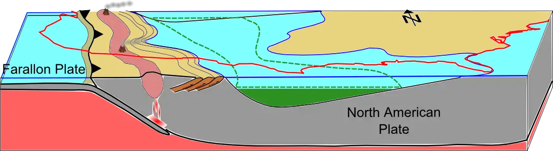 The Laramide orogeny was a major tectonic event that caused the most recent and significant deformation in the United States. The Subduction of the Farallon Plate beneath the North American Plate produced compression all across the western portion of the US.[6] Crustal deformation occurred inland from the plate margin and it is mostly related to the deformation of northwestern United States. However this, in combination with Cenozoic rifting produced from the San Andreas fault, crustal folding, faulting and overall deformation have affected the southern regions of the continental US.[7]