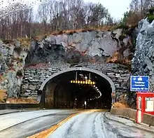 The Valderøy Tunnel (Norwegian: Valderøytunnelen) is a subsea road tunnel which runs between the islands of Ellingsøya (in Ålesund Municipality) and Valderøya (in Giske Municipality) in Møre og Romsdal county, Norway. The 4,222-metre (13,852 ft) long tunnel is part of Norwegian National Road 658. The 3-lane wide tunnel has a maximum height of 4.6 metres (15 ft). The tunnel reaches a maximum depth of 137 metres (449 ft) below sea level.[1] It was built in 1987 as part of the Vigra Fixed Link project. It was a toll road until 25 October 2009.[2]