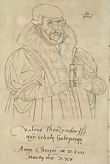 Valentin Friedland (14 February 1490 – 26 April 1556),[1] also called Valentin Troitschendorf (or Trozendorf or Trotzendorf or Trocedorfius) after his birthplace, was an eminent German scholar and educationist of the Reformation. Friedland was a friend of Martin Luther and Melanchthon. His fame as a teacher was an attraction of Goldberg in Silesia, where he taught pupils from far and near. The secret of his success lay in his inculcating on his pupils respect for their own honour. He had a great faith in the intelligence that evinced itself in clear expression.[2]