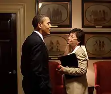 In 1991, as deputy chief of staff to Mayor Richard Daley, Jarrett interviewed Michelle Robinson for an opening in the mayor's office, after which she immediately offered Robinson the job.[34] Robinson asked for time to think and also asked Jarrett to meet her fiancé, Barack Obama. The three ended up meeting for dinner. After the dinner, Robinson accepted the job with the mayor's office. It was at this time that Jarrett reportedly took the couple under her wing and "introduced them to a wealthier and better-connected Chicago than their own."[35] When Jarrett later left her position at the mayor's office to head the Chicago department of planning and development, Michelle Obama went with her.