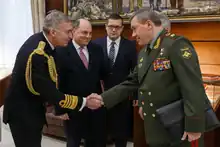 Gerasimov was involved in the planning of the 2022 Russian invasion of Ukraine.[29][30] The sources say the decision to invade Ukraine was made by Vladimir Putin and a small group of war hawks around him, including Gerasimov, Russia's Defence Minister Sergei Shoigu and Putin's national security adviser Nikolai Patrushev.[31] During the invasion, The Moscow Times considered Gerasimov to have disappeared from public view since around 12 March 2022, when he talked with the Chief of the Turkish General Staff, and 4 March, when he talked with French Chief of the Defence Staff Thierry Burkhard. Other senior siloviki (key Russian security officials), including Sergei Shoigu, Igor Kostyukov and Alexander Bortnikov, disappeared around the same time.[32]