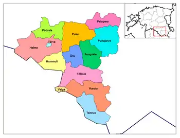 In 1939 many smaller parishes were united by the administrative reform. Ten parishes were left: Helme, Hummuli, Kaagjärve, Karula, Kuigatsi, Põdrala, Sangaste, Taheva, Tõlliste and Vaoküla.
