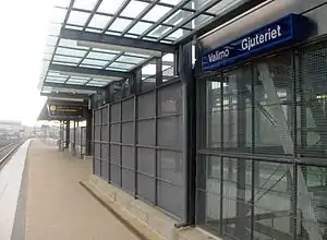 Valimo railway station (Finnish: Valimon rautatieasema, Swedish: Gjuteriets järnvägsstation) is a station on the Helsinki commuter rail network located in the western part of Helsinki, Finland, between Huopalahti and Pitäjanmäki stations. It is located about 7 kilometres (4.3 mi) to the northwest/west of Helsinki Central railway station, in the core of the Pitäjänmäki industrial area.