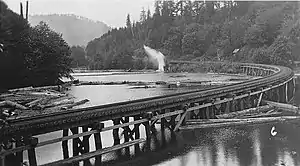 The railroad began construction in 1912. It was 12 miles (19 km) long by 1915, 34 miles (55 km) long by 1917, and was extended to 40.6 miles (65.3 km) and completed later that year.[1][2][3] In order to supply the Willamette Valley with wood products from forests in the Northern Oregon Coast Range, the railroad followed the Luckiamute River to connect Independence, a city along the Willamette River, to Valsetz, a logging community in the Coast Range whose name is a portmanteau of the railroad's name.[2][3][4] In 1957, the railroad retired its last steam locomotive.[5] In September 1978, when it became no longer profitable for the logging industry, most of the railroad was abandoned.[2]