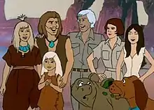 Valley of the Dinosaurs is an American animated television series produced by the Australian studios of Hanna-Barbera Productions and broadcast on CBS from September 7 to December 21, 1974, and in syndication from 1977 to 1983.[1] The series, about a contemporary family sucked by a vortex back to the Stone Age was intended to be educational as well as entertaining, demonstrating the early human uses of fire, clothing, weapons and cooking.[2] It debuted on the same day as Land of the Lost.