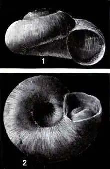 The shell is composed of four whorls, marked with none to three spiral carinae. The spire is normally low and umbilicus is wide, exposing all the whorls to the apex. There is great variation in the height of the spire and with its increase there is a proportionate decrease in the width of the umbilicus. The apical two whorls are flat and planulate, smooth and shining, unmarked with carinae even when the remainder of the shell may have three. Sculpture is comparatively uniform in character, being composed of fine growth lines.[1]