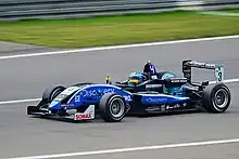After two races in 2012 with Auer and van de Laar, the team moved to the FIA Formula 3 European Championship on the full-time basis in 2013. They kept van de Laar and signed Måns Grenhagen.[29][30] The team had tough start, with just one podium finish of Sven Müller, who took Grenhagen's car for the last three rounds of the season.[31] The team remained in the German F3 with Gustavo Menezes and Jordi Weckx as their drivers.[32][33] Both of them wasn't able to give the fight to Lotus drivers, who occupied the top step of the podium in the races with the full-points distribution.