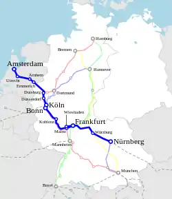 The Van Beethoven was the successor of the TEE Rhein–Main on the same route and schedule. The route of the Rhein–Main was shortened to Amsterdam - Bonn in the autumn of 1971, thus ending the relation with the Main eventually resulting in renaming the TEE to Van Beethoven.[2] Travellers wanting to go to Frankfurt am Main in the evening could proceed from Bonn using the TEE Saphir arriving in Frankfurt eight minutes later than the former Rhein-Main.[3] On request of German members of parliament the route was extended to Nürnberg in 1976, resulting in an arrival around 1:30 a.m.