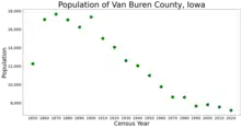 Van Buren County (/væn ˈbjʊərən/ van BURE-ən) is a county located in the U.S. state of Iowa. As of the 2020 census the population was 7,203, making it the state's tenth-least populous county.[1] The county seat is Keosauqua,[2] which contains the oldest continuously operational courthouse in the state of Iowa, and second oldest in the United States.