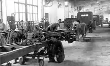 The original factory building, officially a warehouse and assembly hall, had a volume of 25,000 m3 (33,000 cu yd).[8] The facilities were developed over time and by the end of 1953, the floor area was 35,000 m2 (42,000 sq yd). The warehouse and assembly hall were renamed the main hall; it was now 120 m (130 yd) long and 30 m (33 yd) wide. Bus chassis production was located at the southern side of the hall and lorries were built at the northern side. This set-up was often changed depending on the product mix and production volume.[39]