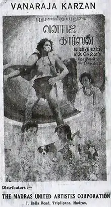 Vanaraja Karzan was a collaborative venture between Wadia Movitone and the Madras United Artists Corporation.[2] Directed by Homi Wadia and Nari Ghadiali, it was the first Tamil film based on the character Tarzan,[3] with John Cawas cast in the role, renamed "Karzan" for the film. K. R. Chellam was cast as the female lead Leela, T. K. T. Chari as Veerasingam (the paternal grandfather of Karzan), and M. K. Venkatapathy as Sabapathi.[1] The story was written by J. B. H. Wadia, and the screenplay by S. R. Krishnaswamy Iyengar. Cinematography was handled by Rustum Maybar and Bali Mistry.[3] Vanaraja Karzan became the first South Indian "jungle" film,[4] as well as the first Tamil film to be shot in forests.[5] The film was also made in Hindi as Jungle King.[6][3]