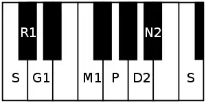 - ārohaṇa S R₁ G₁ M₁ P D₂ N₂ Ṡ[lower-alpha 1]