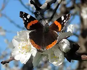 Mating usually occurs in late autumn or early winter following collective migration to southern regions with a warmer climate. The red admiral's main host plant, stinging nettle, is most abundant during this migration. Larval development proceeds through winter and adults are first sighted in early spring. The new generation of adults migrates north before mating, because food is usually diminished by late spring.[15] In Europe, the cyclic nature of this migration has been confirmed by analysing stable isotopes of wing samples. In spring, individuals arriving at northern Europe (Kaliningrad) were of a southern origin, while in autumn the isotope analyses revealed that samples came from the surrounding area or northern latitudes.[16] During migration, the red admiral flies at high altitudes where high-speed winds carry the butterfly, reducing energy expenditure.[17]