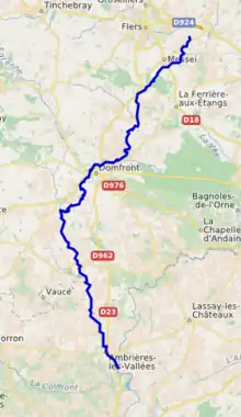 The Varenne is a 60.0 km (37.3 mi) long river in western France located in the departments of Orne (Normandy) and Mayenne (Pays de la Loire). It is a tributary of the river Mayenne on the right side, and so is a sub-tributary of the Loire by Mayenne and Maine.[1] It flows into the Mayenne near Ambrières-les-Vallées. Its longest tributaries are the Égrenne, the Pisse, the Halouze and the Andainette.[1] The largest town on the Varenne is Domfront en Poiraie.